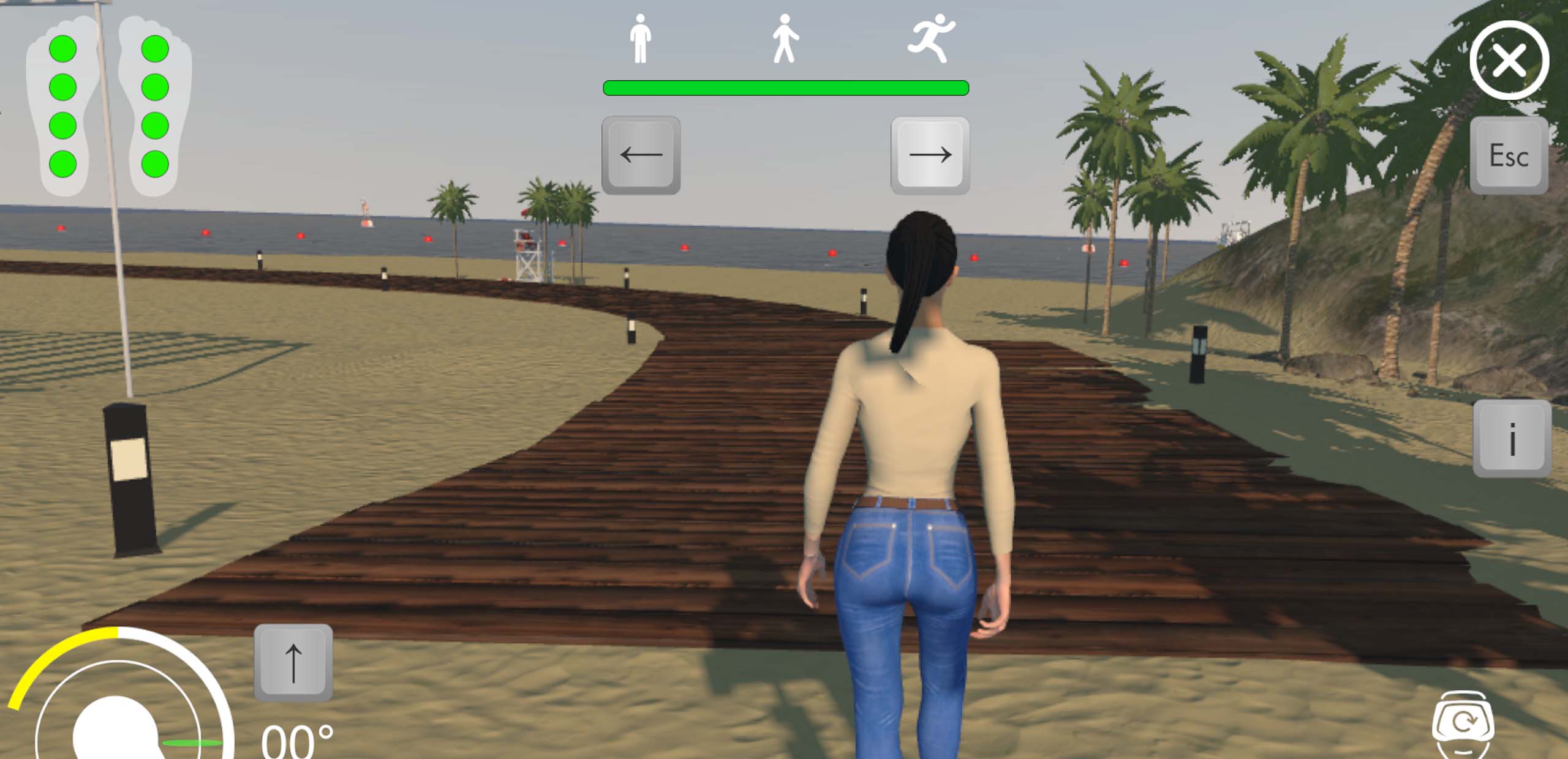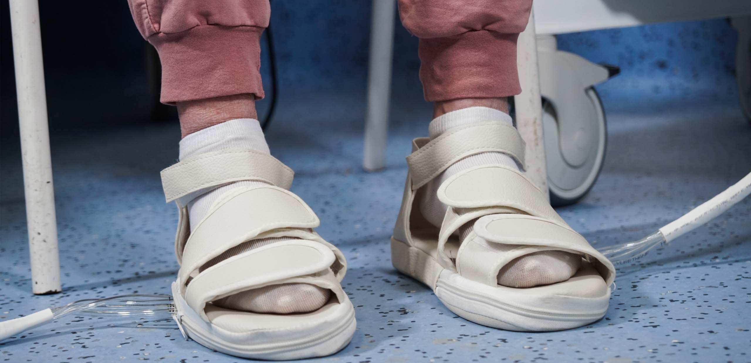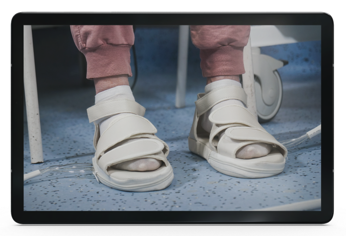 Built-in pneumatic airbags creating the sensation of heel-to-toe walking, while the patient hears the sounds of footsteps