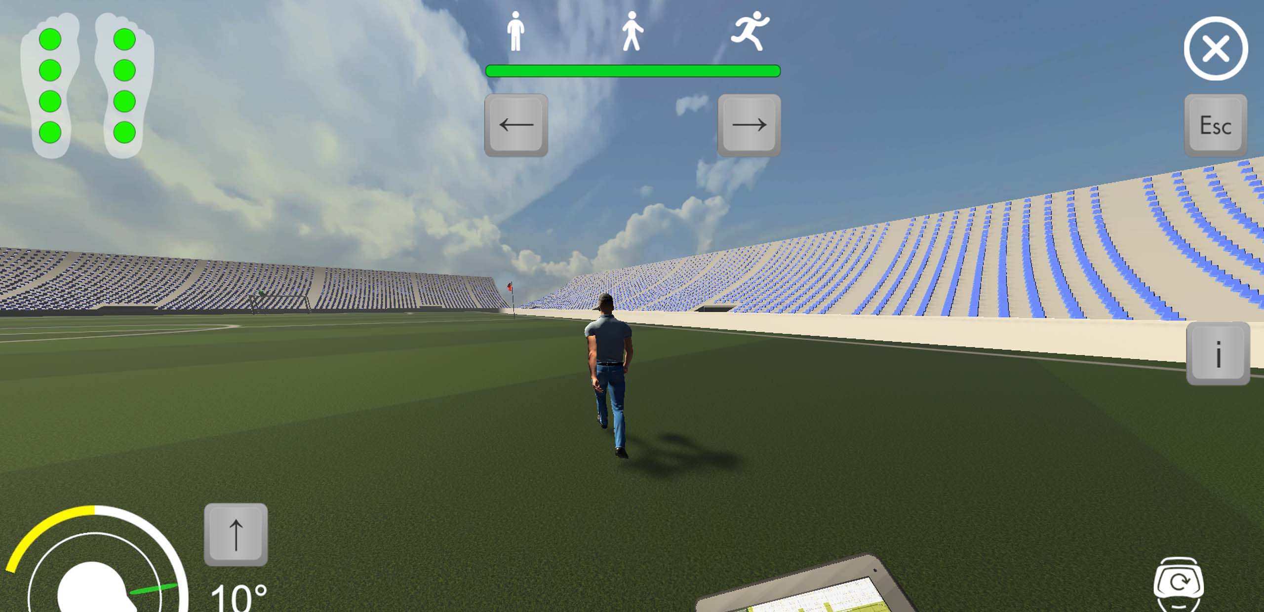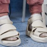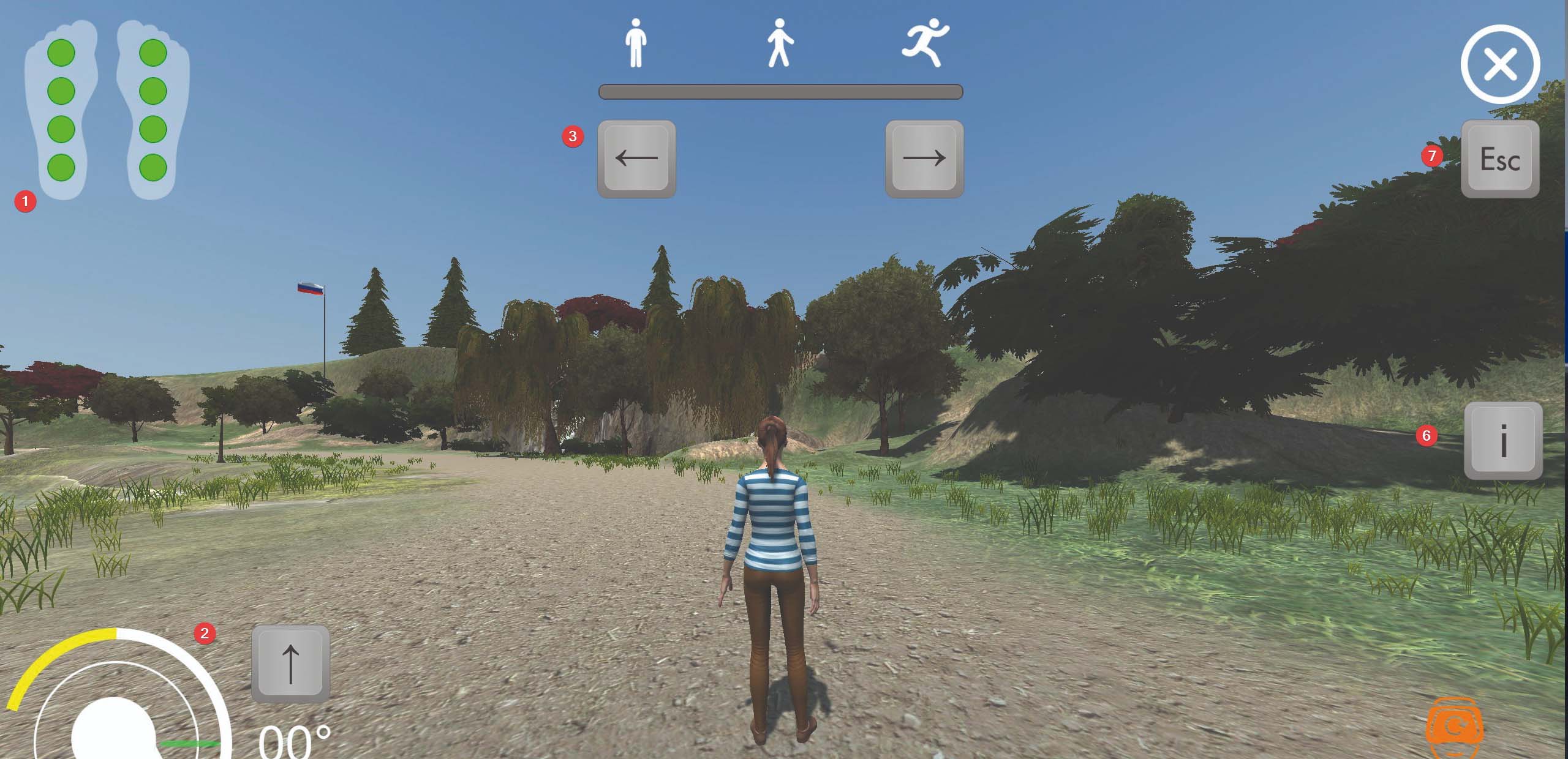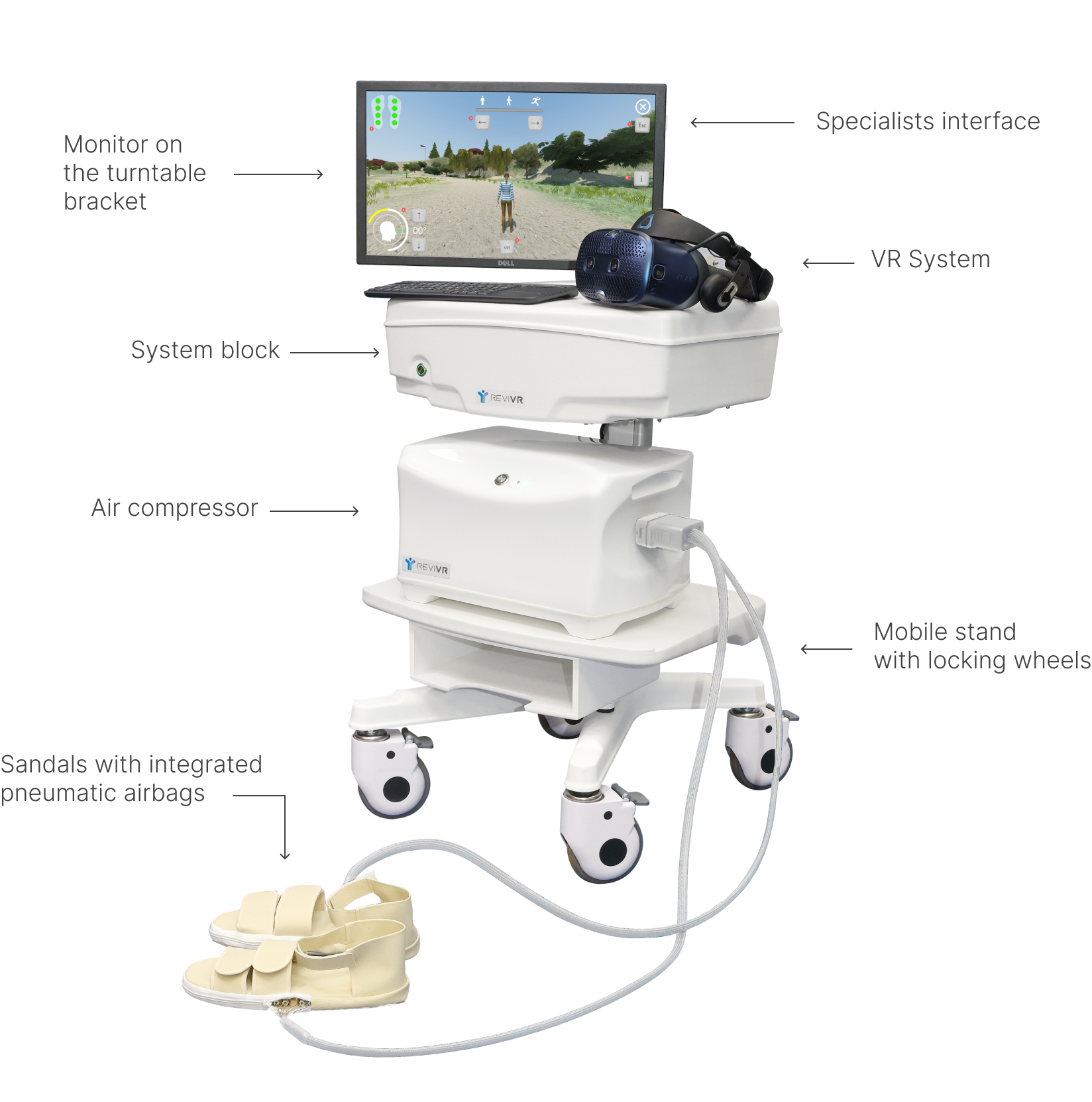 Built-in pneumatic airbags creating the sensation of heel-to-toe walking, while the patient hears the sounds of footsteps