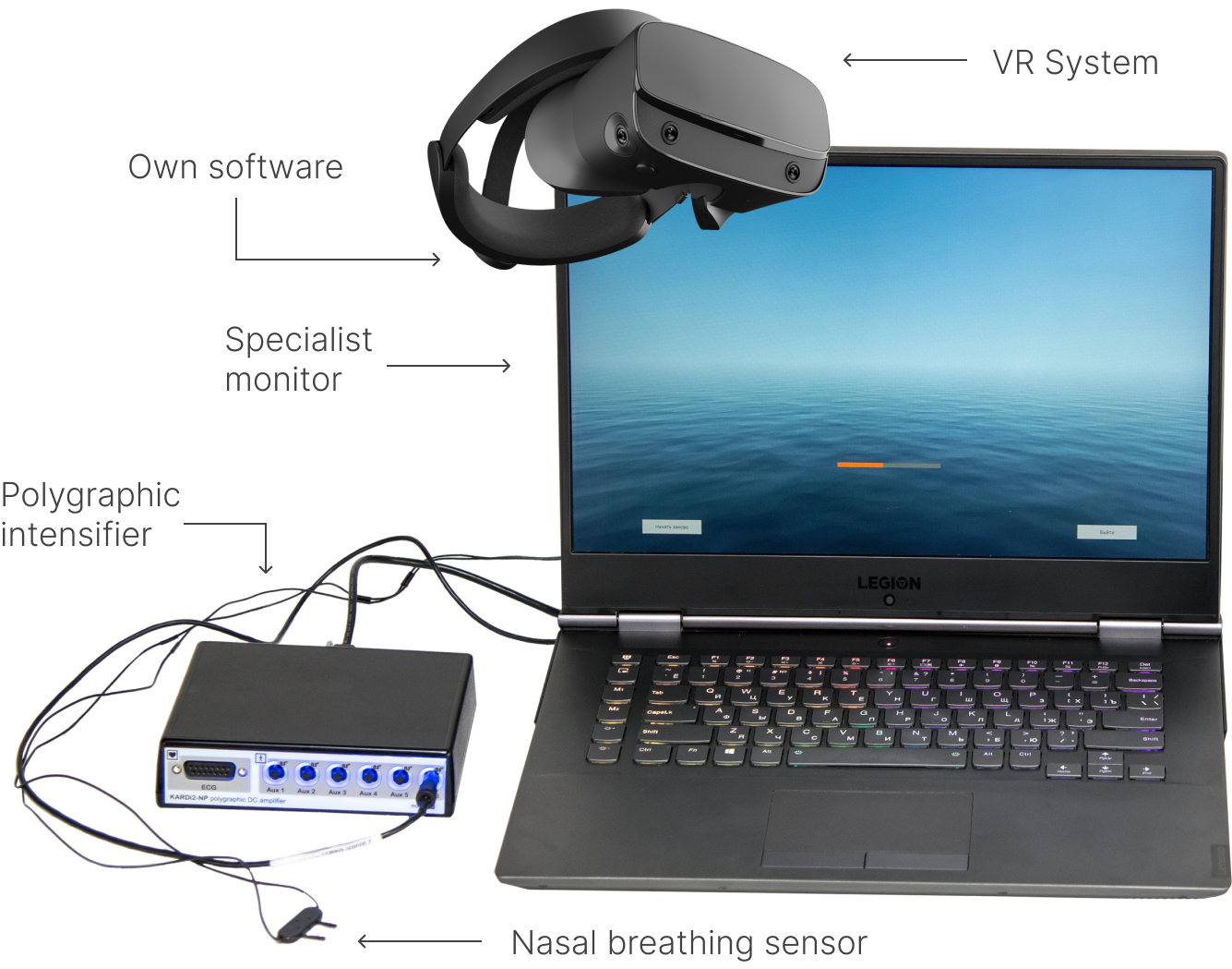 With the help of biofeedback between the breathing sensor and changing virtual reality animation, the patient independently visually tracks his breathing rate using the software